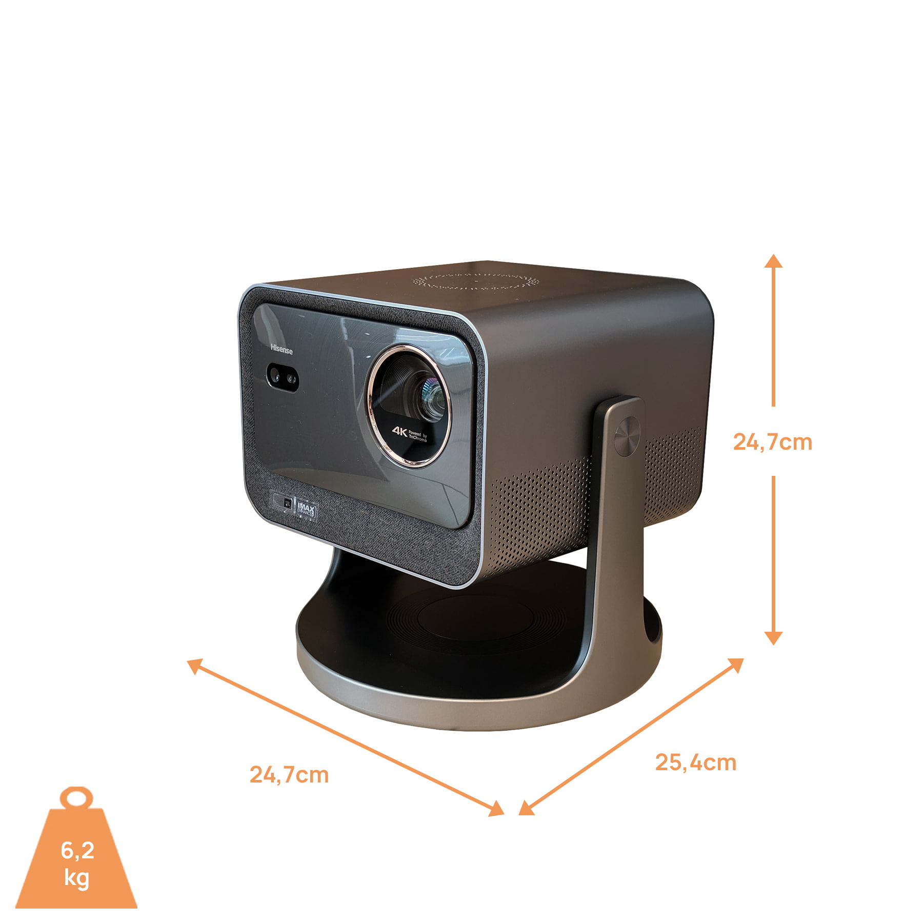 Mit seinen 2.500 ANSI-Lumen Spitzenhelligkeit eignet sich der Hisense C3 TriChroma aus unserer Sicht am ehesten für nicht vollständig abgedunkelte Innenräume, in denen noch etwas (kontrollierbares) Restlicht verbleiben darf. Der DLP Beamer punktet mit einer sehr flexiblen Aufstellung dank schwenkbarem Standfuß/Gimbal (360 Grad horizontal und 135 Grad vertikal). Hinzu kommt eine kinderleichte, KI-gestützte Bildausrichtung mit u. a. Autofokus, automatischer Hinderniserkennung sowie automatischer digitaler Trapezkorrektur. Damit musst du kaum mehr tun, als den Beamer im passenden Abstand zur Leinwand aufzustellen – schon kannst du loslegen. Der optische Zoom (Projektionsverhältnis: 1,0 – 1,3:1) unterstützt dich zusätzlich dabei. Insgesamt sind mit dem C3 – abhängig von Leinwandabstand und Verdunkelungsgrad – überwältigende Bilddiagonalen von bis zu 300 Zoll möglich. Kompakte Abmessungen und ein vergleichsweise geringes Gewicht laden zusätzlich dazu ein, diesen Beamer in verschiedenen Räumen aufzustellen oder ihn mit zu Freunden zu nehmen. Aber der Hisense C3 TriChroma ist nicht nur für Filmfans interessant, auch Gaming Freunde dürfen einen näheren Blick riskieren: Der Beamer weiß durch seinen angenehm niedrigen Input Lag zu gefallen, wodurch sich die meisten Gaming Genre bis hin zu Actionspielen sehr gut und flüssig spielen lassen.